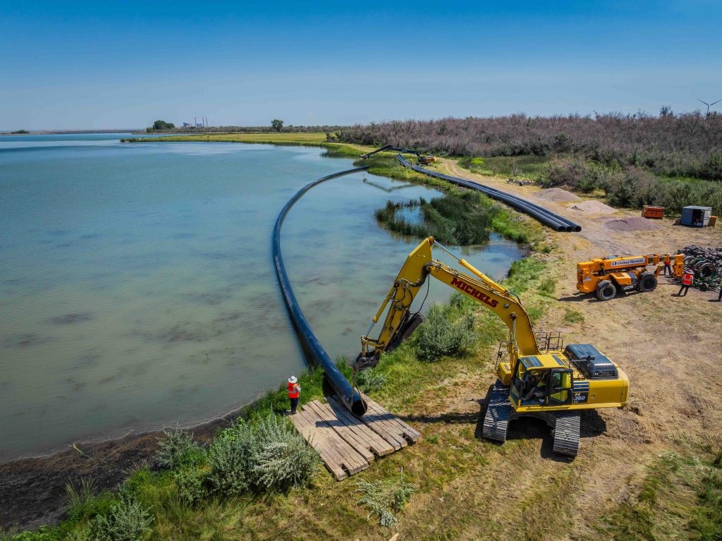 - Crews used a pullhead installation method, guiding a rope and steel cable through the existing pipe, with watercraft assisting alignment and movement on the lake surface.